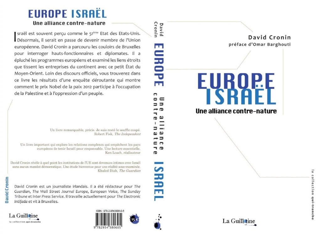 En 2010, David Cronin livrait une enquête sur les liens entre l’Europe et Israël. Le journaliste irlandais démontre que malgré les discours en faveur d’une paix en Palestine et du respect du droit humanitaire, de nombreux États (dont la France), l’Union européenne et de grandes entreprises font des affaires avec l’État hébreu sans se soucier du sort des Palestiniens. Un point essentiel pour comprendre l’actuelle inaction des Européens pour engager des sanctions contre Israël en dépit des violations du droit international et des crimes de guerre observés depuis l’engagement des représailles contre le Hamas, les exactions contre les civils à Gaza et en Cisjordanie, les assassinats de journalistes et la destruction des infrastructures à Gaza.