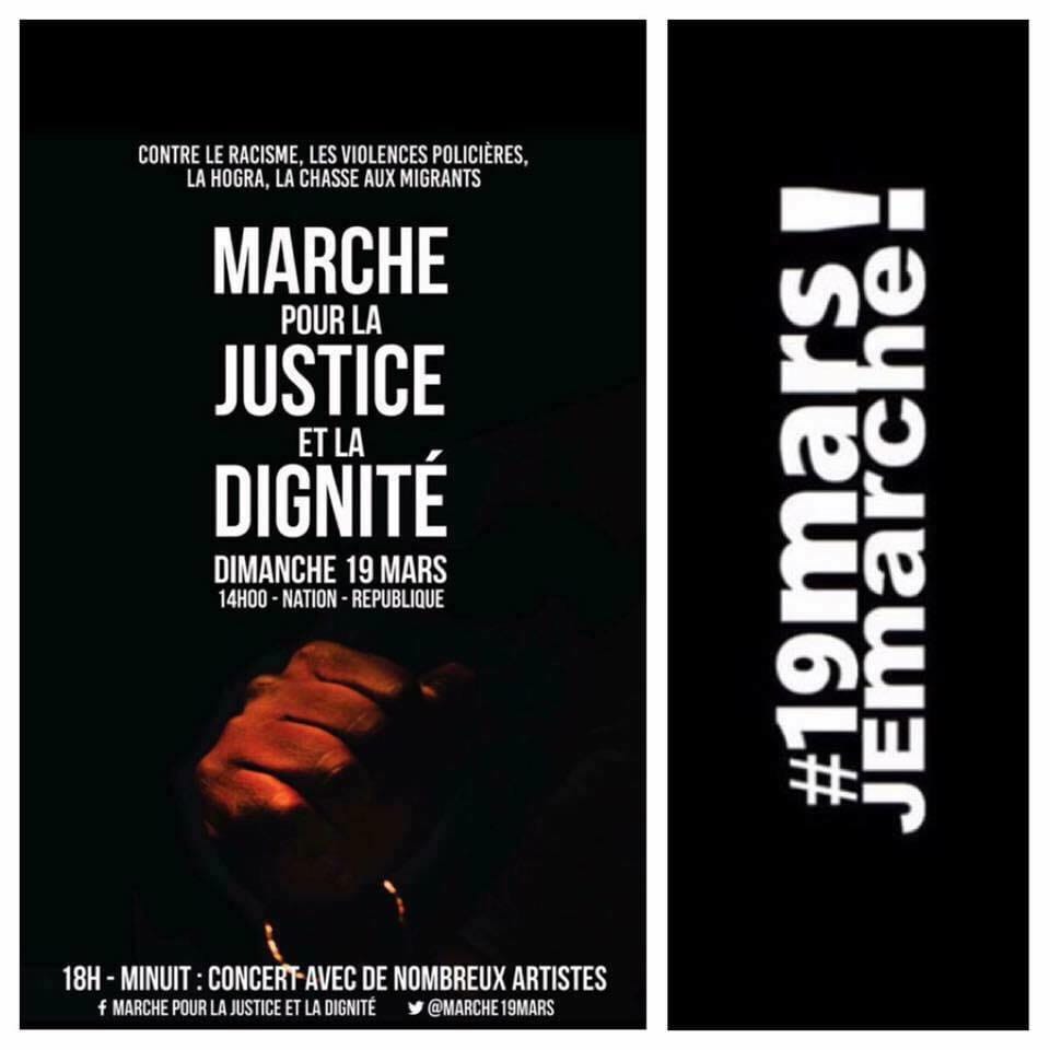 Nous appelons tout-e-s celles et ceux qui se sentent concernés par ces sujets à nous rejoindre dans toutes les initiatives à venir (voir calendrier au bas de la page) et à participer très largement à la Marche pour la Justice et la Dignité qui aura lieu le dimanche 19 mars 2017 à Paris.Contre la hogra, contre l’humiliation, contre le racisme et les violences policières, contre les guerres lâches faites en notre nom contre des peuples qui ne nous ont rien fait.