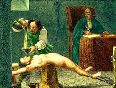 Au deuxième étage du musée de l’inquisition, j’ai été confronté à « La Toca La Tortura Del Agua » (Torture du Tissu – ou de l’Eau) décrite en ces termes : « la victime était attachée par ses mains et ses pieds à une grille…L’accusé était ensuite forcé d’ouvrir sa bouche et un tissu était enfoncé dans sa gorge. Des litres d’eau étaient ensuite versés et le prisonnier était obligé d’avaler. Le tissu trempé causait une sensation terrible d’étouffement qui obligeait ainsi le prisonnier à continuer à boire. La sévérité de la torture se mesurait à la quantité d’eau versée. Souvent le tissu était mis de façon abrupte, faisant ainsi saigner la gorge… ». La « torture du Tissu – ou de l’Eau » ne semble t-elle pas similaire ou familière au grand régime de torture institué sous le nom de « guerre du terrorisme » !