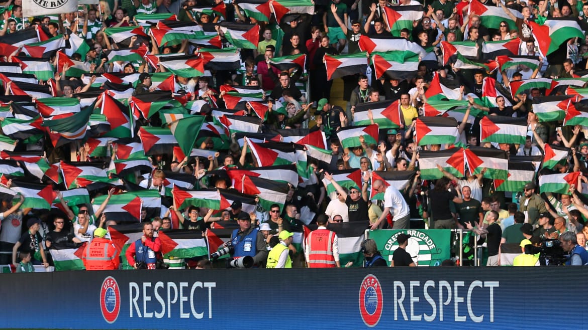 Fans hold up Palestine flags