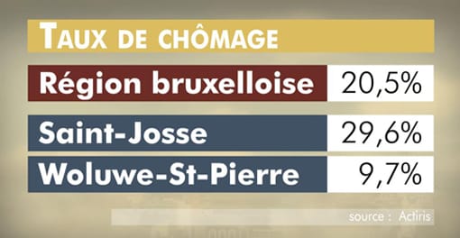 Selon les derniers chiffres du service de l’emploi bruxellois Actiris, le taux de chômage était de 20,5% fin mars. Sans surprise, il connaît de fortes disparités selon les communes. A Saint-Josse-ten-Noode et Molenbeek, il avoisine les 30%. Par contre, à Woluwe-Saint-Pierre, le taux est juste en dessous des 10%. Le taux de chômage de la Région bruxelloise était de 20,5% fin mars. En Flandre, le taux de chômage était de 7,18% et en Wallonie de 13,6%.