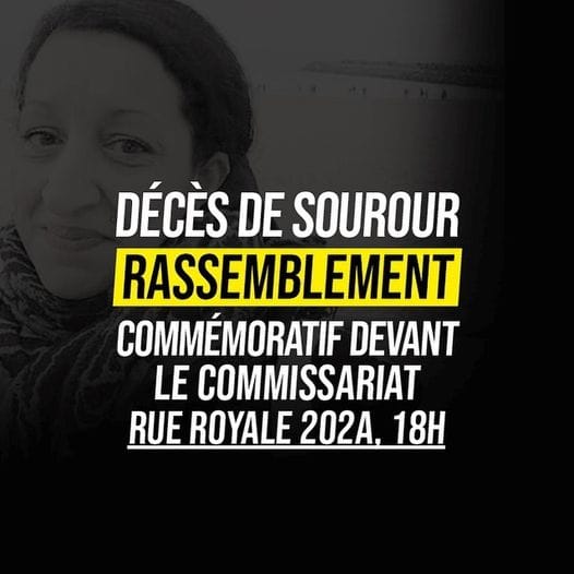 Afin de commémorer sa mémoire, sa joie de vivre et son profond attachement aux relations humaines positives, constructives et motivées par de meilleurs lendemains, nous vous proposons de lui rendre femmage. Un rassemblement de deuil et de recueillement est organisé ce dimanche 15 janvier, à 18h, devant le commissariat où Sourour est décédée (Rue Royale 202A – 1000 Bruxelles). Toutes les associations qui souhaiteraient collaborer dans cette action sont invitées à nous contacter, afin que nous puissions les ajouter en tant que co-organisatrices