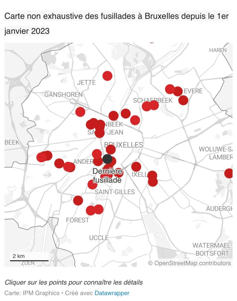 Si l’utilisation d’arme à feu se fait parfois dans le cadre de violences homophobes, d’un attentat ou de féminicides à Bruxelles, la plupart des incidents ont une cause encore « inconnue » au moment où les faits sont relayés dans les médias. Mais le lieu, les personnes impliquées, auteurs ou victimes,et le modus operandi laissent à penser qu’ils sont en lien avec le milieu de la drogue. Voilà pourquoi elles sont répertoriées sous la légende « Inconnu/drogue » dans la carte ci-dessous.