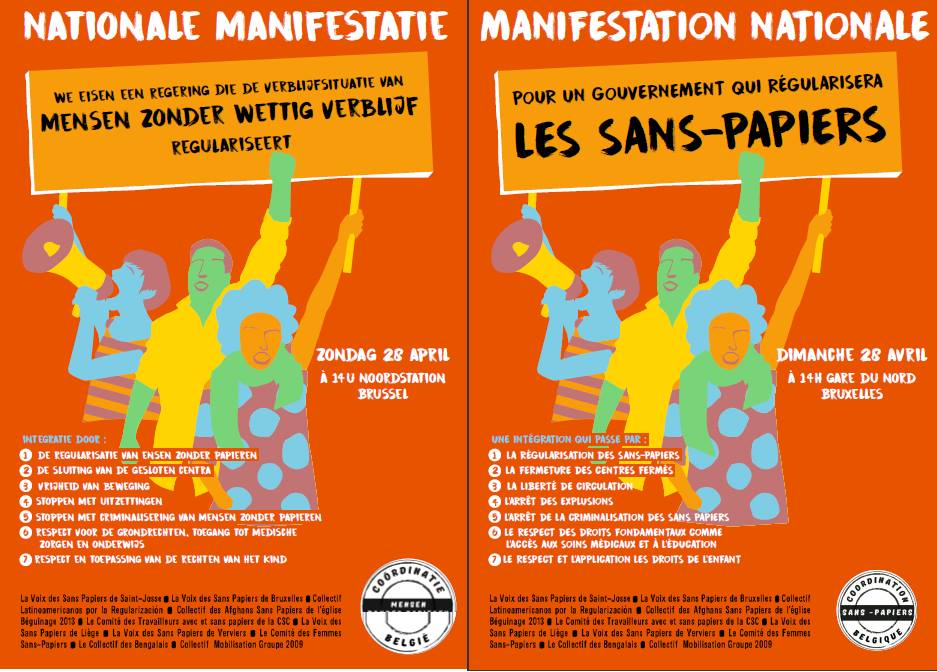 Pour cela, la Coordination des sans-papiers de Belgique appelle l’ensemble des sans-papiers tapis dans l’ombre et tous nos soutiens pour alerter sur notre situation et mobiliser le plus grand nombre citoyen.ne.s à venir exiger des engagements solennels des partis politiques sur l’intégration des sans-papiers dans l’Etat de droit belge.