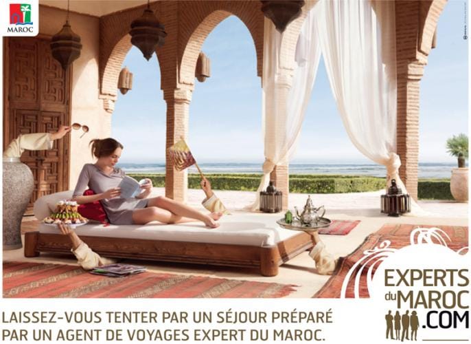 Vous avez peut-être, comme moi, remarqué la campagne massive d’affichage publicitaire à l’initiative des ExpertsduMaroc.com. On y voit une jeune femme blanche, allongée au milieu d’un décor oriental, lisant tandis qu’un bras sort de sous le tapis pour lui tendre un plateau garni d’une théière et d’un verre fourré de menthe, qu’un autre bras tend, depuis le dessous du lit, un plat où s’amoncèlent des pâtisseries orientales, qu’un autre sort d’un vase et lui tend des lunettes de soleil, et qu’un dernier, de l’autre côté, l’évente. On suppose tous ces bras arabes puisque glissés dans des manches de type oriental.