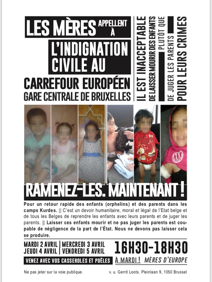 Les ‘Mères d’Europe’ mèneront une action paisible proche de la Gare Centrale. Elles s’ exprimeront aux cliquetis de pot de 2 avril jusqu’au 5 avril ’19, de 16.30 h à 18.30 h. Les ‘Mères d’Europe’ demandent au gouvernement fédéral de rapatrier immédiatement les enfants belges des camps kurdes et de poursuivre les combattants de EI en Belgique. Parmi les enfants sont des orphelins, des malades et des morts à déplorer. Ils souffrent tous de privation, de malnutrition et d’ insécurité. Ces enfants ne sont pas tenus à mourir là-bas parce que le gouvernement refuse de juger leurs parents ici. Ne rien faire pour eux revient à une omission volontaire. RAMENÉ-LES VITE !
