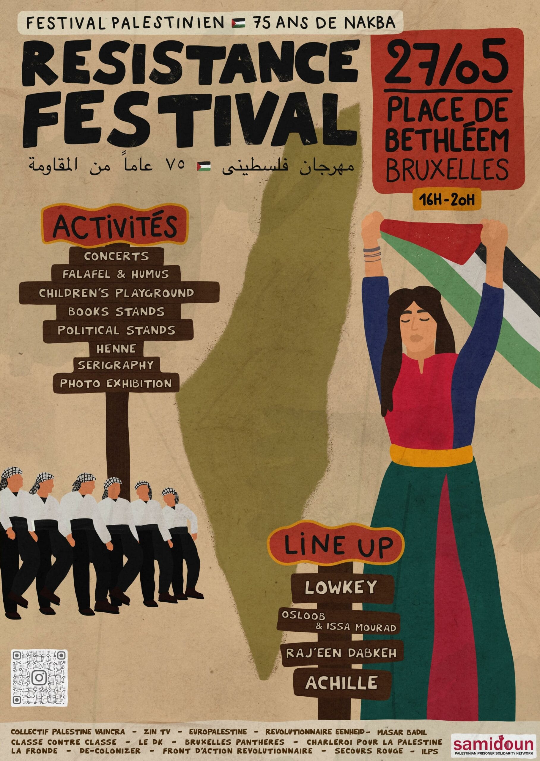 Samedi 27 mai à Bruxelles en Belgique, Samidoun Brussels organise le Festival Résistance de 16H à 20H place Bethléem. Au programme, des concerts (Lowkey, Achille et Osloob & Issa Mourad), un spectacle de dabke, des expositions, des stands politiques et culturels et des jeux pour enfants. De nombreuses organisations soutiennent cette initiative et seront présentes, dont Bruxelles Panthères.